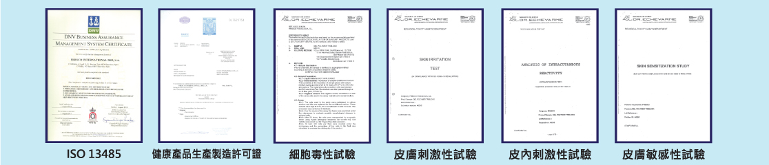 Fresco之開發實驗室、工廠與產品,均已通過CE與FDA健康產品認證。同時符合歐盟規格之GMP自有製造廠與ISO認證。( European Medical Manufacturing Licence 5649-PS;ISO 13485 )