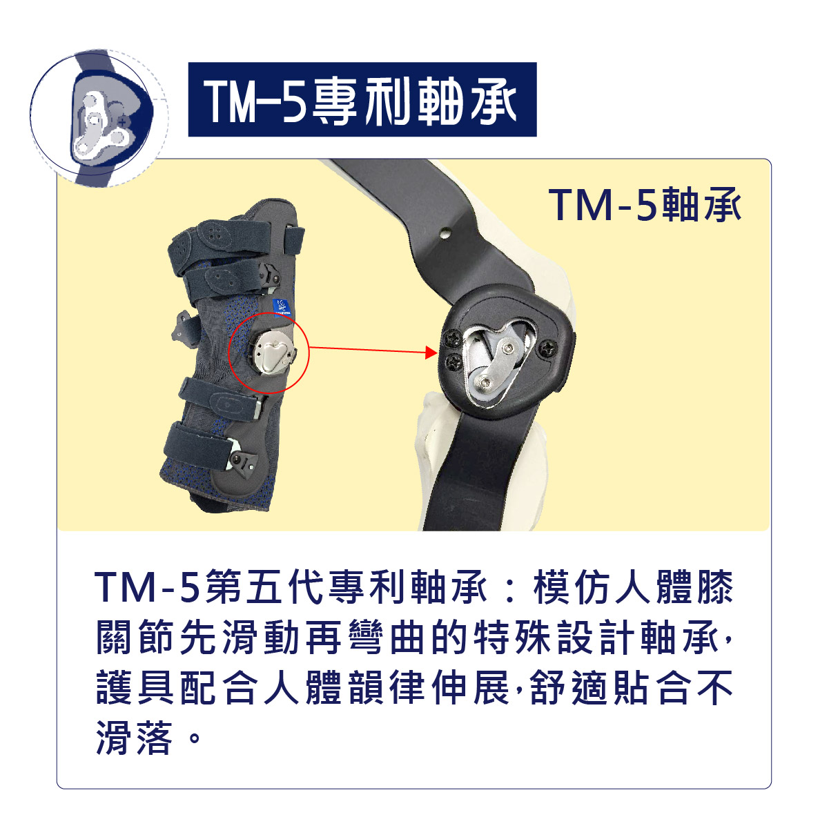 (1) 兩側鋁合金側條搭配模擬膝關節律動的TM-5軸承。