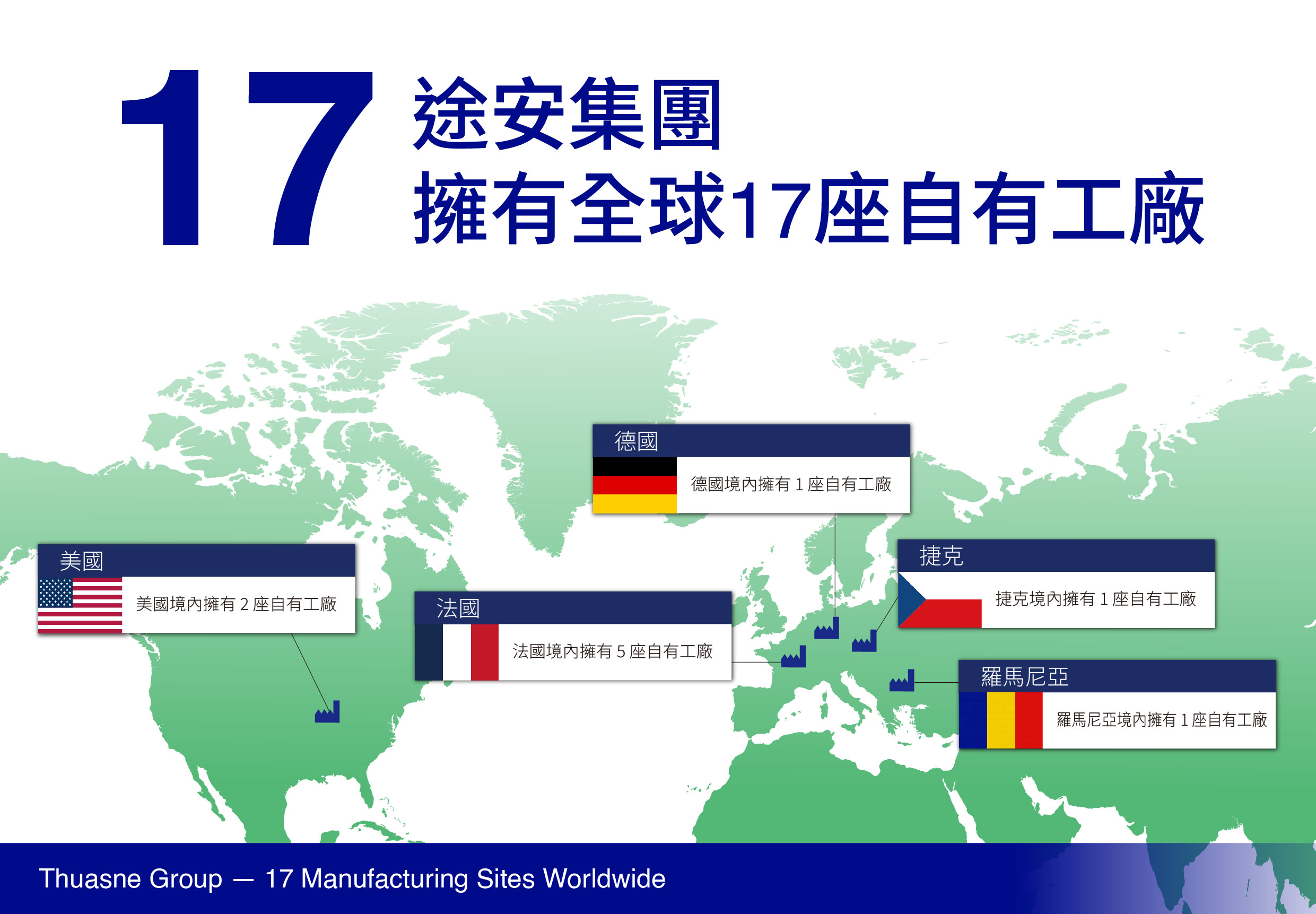 途安集團在歐洲、美國擁有 17 座自有工廠,從法國、德國、捷克、羅馬尼亞到美國,每一座工廠都承載著180年歷史的工藝技術與品質要求 - 以專業與創新,打造世界級的醫療產品。